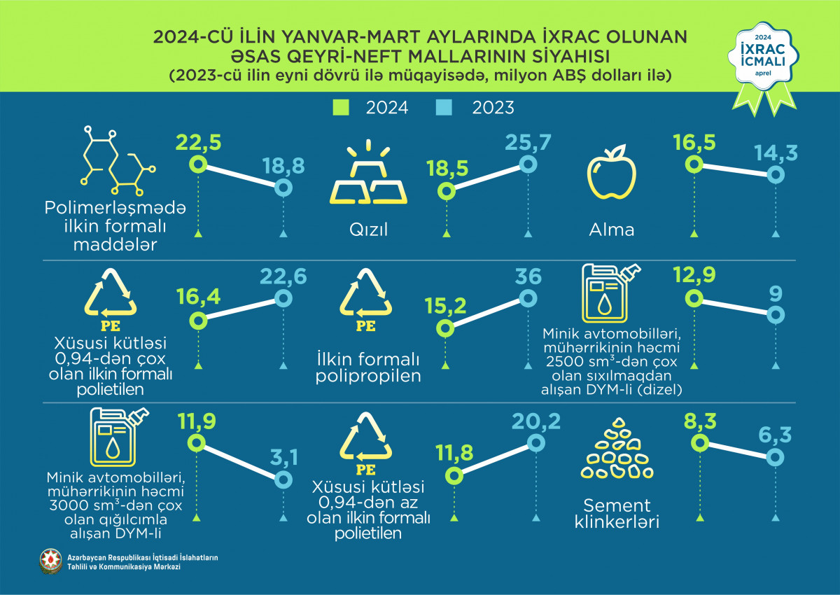 2024-cü ilin mart ayında ixrac edilmiş qeyri-neft sektoruna aid malların siyahısında pambıq mahlıcı (22,9 milyon ABŞ dolları) birinci, pomidor (tomat) (15 milyon ABŞ dolları) ikinci və ilkin formalı polipropilen (12 milyon ABŞ dolları) üçüncü olub.