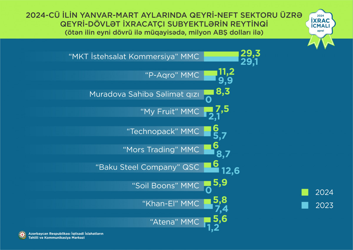 2024-cü ilin yanvar-mart ayları üzrə hazırlanmış qeyri-dövlət ixracatçı subyektlərin reytinqində ilk onluqda aşağıdakı şirkətlər təmsil olunublar: “MKT İstehsalat Kommersiya” MMC, “P-Aqro” MMC, Muradova Sahibə Səlimət qızı, “My Fruit” MMC, “Technopack” MMC, “Mors Trading” MMC, “Baku Steel Company” QSC, “Soil Boons” MMC, “Khan-El” MMC, “Atena” MMC.
