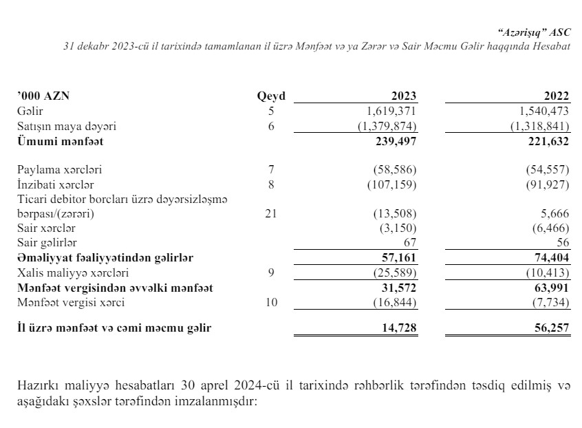 2023-cü ildə “Azərişıq” ASC-nin 1 milyard 619 milyon 371 min manat satış gəlirinin 85,2%-ni və ya 1 milyard 379 milyon 874 min manatını satışın maya dəyəri təşkil edib. Şirkətin digər cəmi xərcləri isə 207 milyon 992 min manat olub. Ötən il “Azərişıq” 31 milyon 572 min manat əməliyyat mənfəətindən 16 milyon 844 min manat mənfəət vergisi ödəyib.