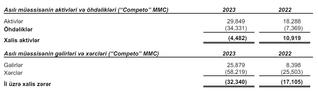 31 dekabr 2023-cü il tarixində “Competo” MMC-nin öhdəlikləri aktivlərini üstələyib. Qeyd olunan tarixdə Şirkətin öhdəlikləri 34 milyon 331 min manat təşkil etdiyindən, xalis aktivləri mənfi 4 milyon 482 min manat olub.