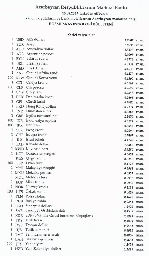 Avqustun 15-nə Mərkəzi Bankın açıqladığı rəsmi Dollar/manat məzənnəsi Avqustun 14-ü ilə müqayisədə dəyişməyərək 1,7007 manat olub, Avro/manat məzənnəsi isə 2.0030 manata düşüb.
