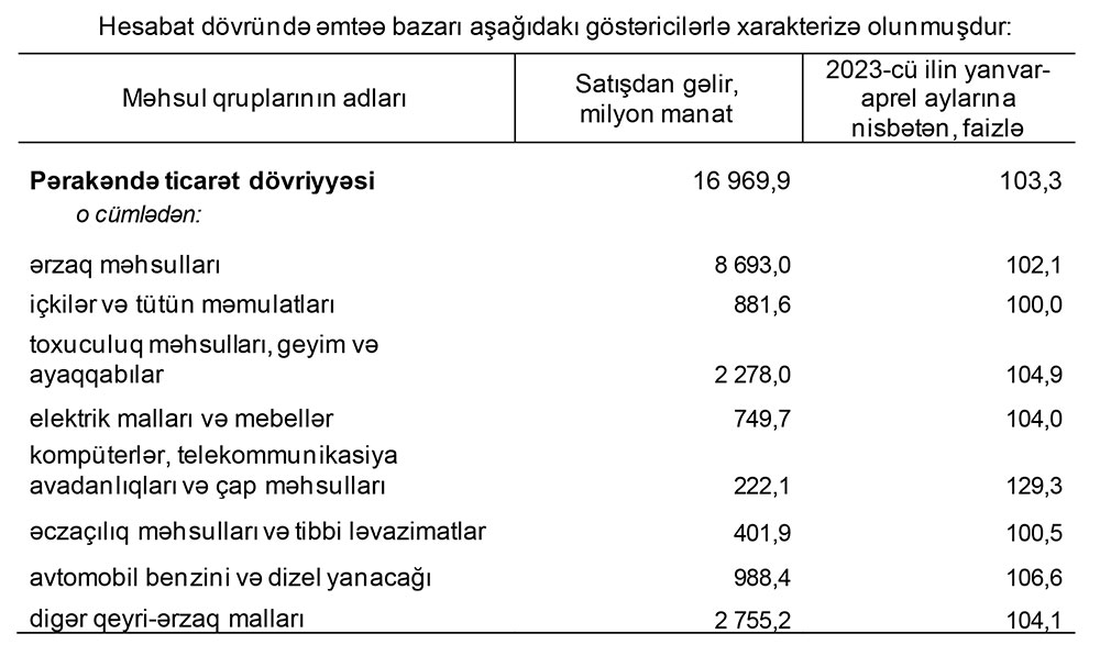 Dövlət Statistika Komitəsinin yaydığı məlumata görə, 2023-cü ilin yanvar-aprel ayları ilə müqayisədə pərakəndə ticarət dövriyyəsi real ifadədə 3,3 faiz, o cümlədən ərzaq məhsulları, içkilər və tütün məmulatları üzrə 1,9 faiz, qeyri-ərzaq malları üzrə 5,1 faiz artmışdır.