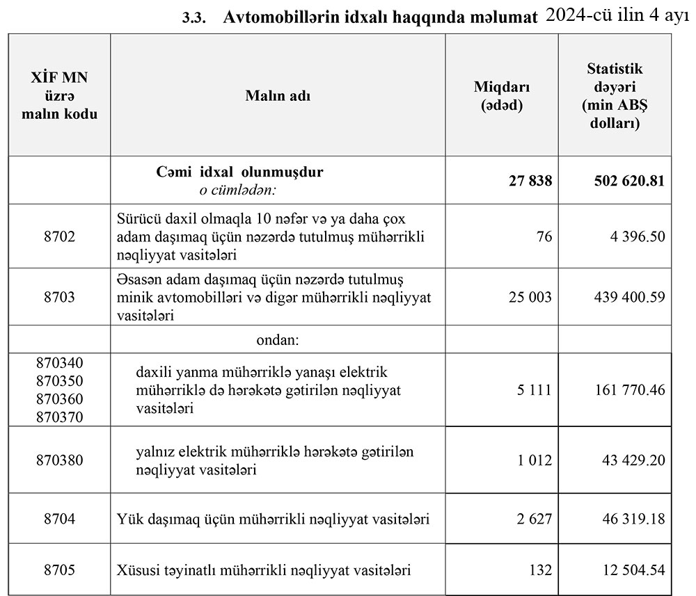 2024-cü ilin yanvar-aprel dövründə (ilk 4 ayda) Azərbaycana 502 milyon 621 min dollar dəyərində 27 min 838 ədəd avtomobil idxal olunub.