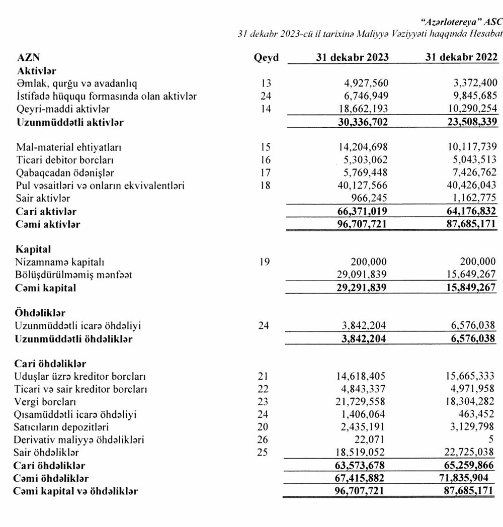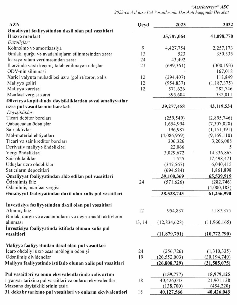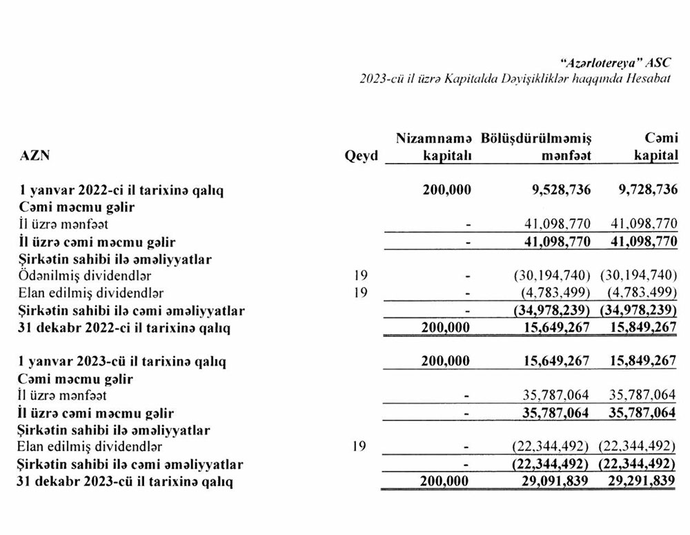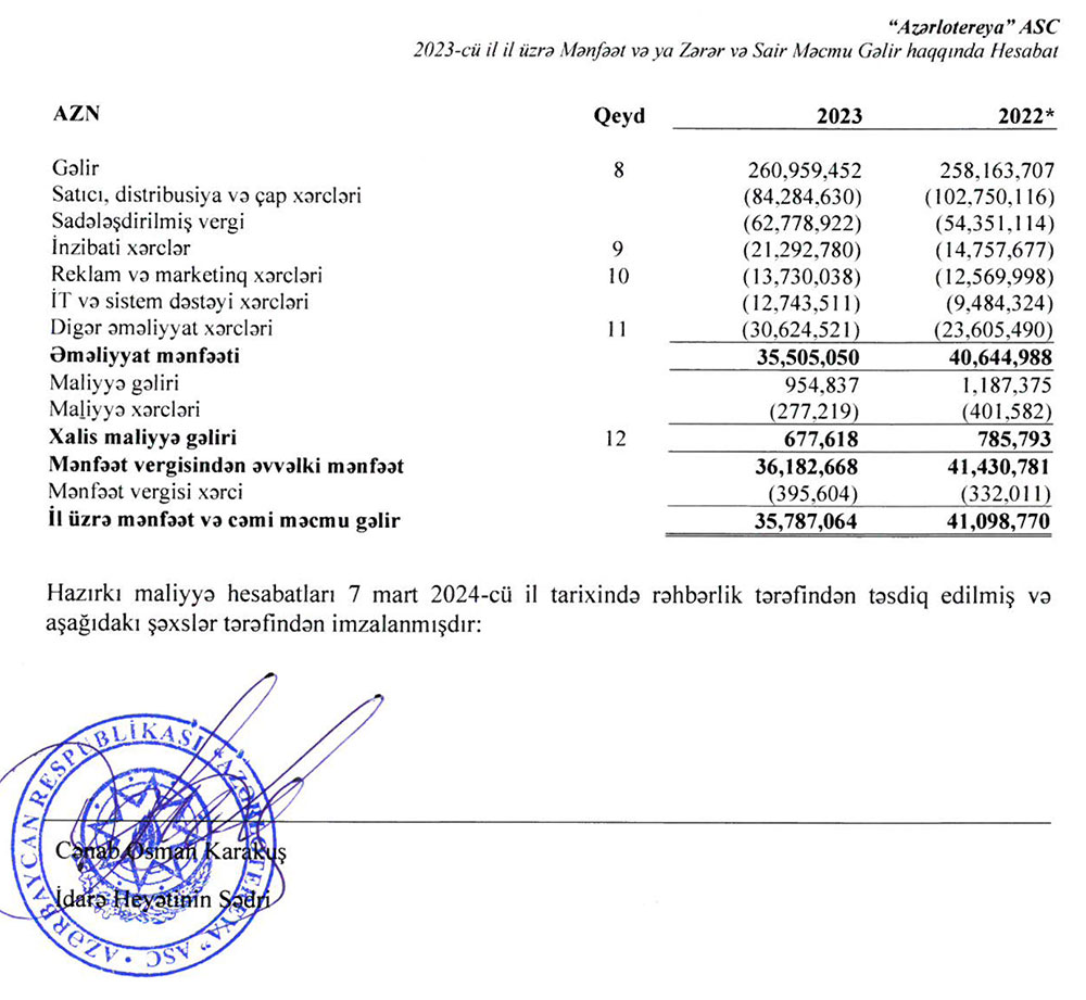 “Azərlotereya” ASC 2023-cü ili 35 milyon 787 min manat xalis mənfəət ilə başa vurub. Şirkət 2022-ci ili 41 milyon 99 min manat xalis mənfəət ilə bağlamışdı. Gəlirin artmasına baxmayaraq xalis mənfəətin 5 milyon 312 min manat və ya 12,9% azalması Şirkətinəməliyyat xərclərinin artması ilə bağlıdır. Belə ki, “Azərlotereya” ASC-nin 2023-cü ildə 2022-ci illə müqayisədə sadələşdirilmiş vergi xərci 15,5% artaraq 62 milyon 779 min manat, inzibati xərcləri 44,3% artaraq 21 milyon 293 min manat, reklam və marketinq xərcləri 9,2% artaraq 13 milyon 730 min manat,İT və sistem dəstəyi xərcləri 34,4% artaraq 12 milyon 744 min manat, digər əməliyyat xərcləri isə 29,7% artaraq 30 milyon 625 min manat təşkil edib.