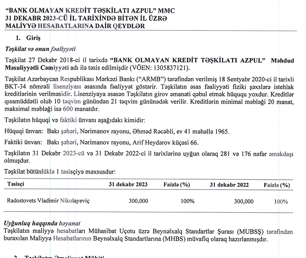 Bank Olmayan Kredit Təşkilatı "AzPul" MMC -nin 100% payçısı Radostovets Vladimir Nikolayeviçdir. Təşkilat 18 sentyabr 2020-ci il tarixli lisenziya əsasında fəaliyyət göstərir.
