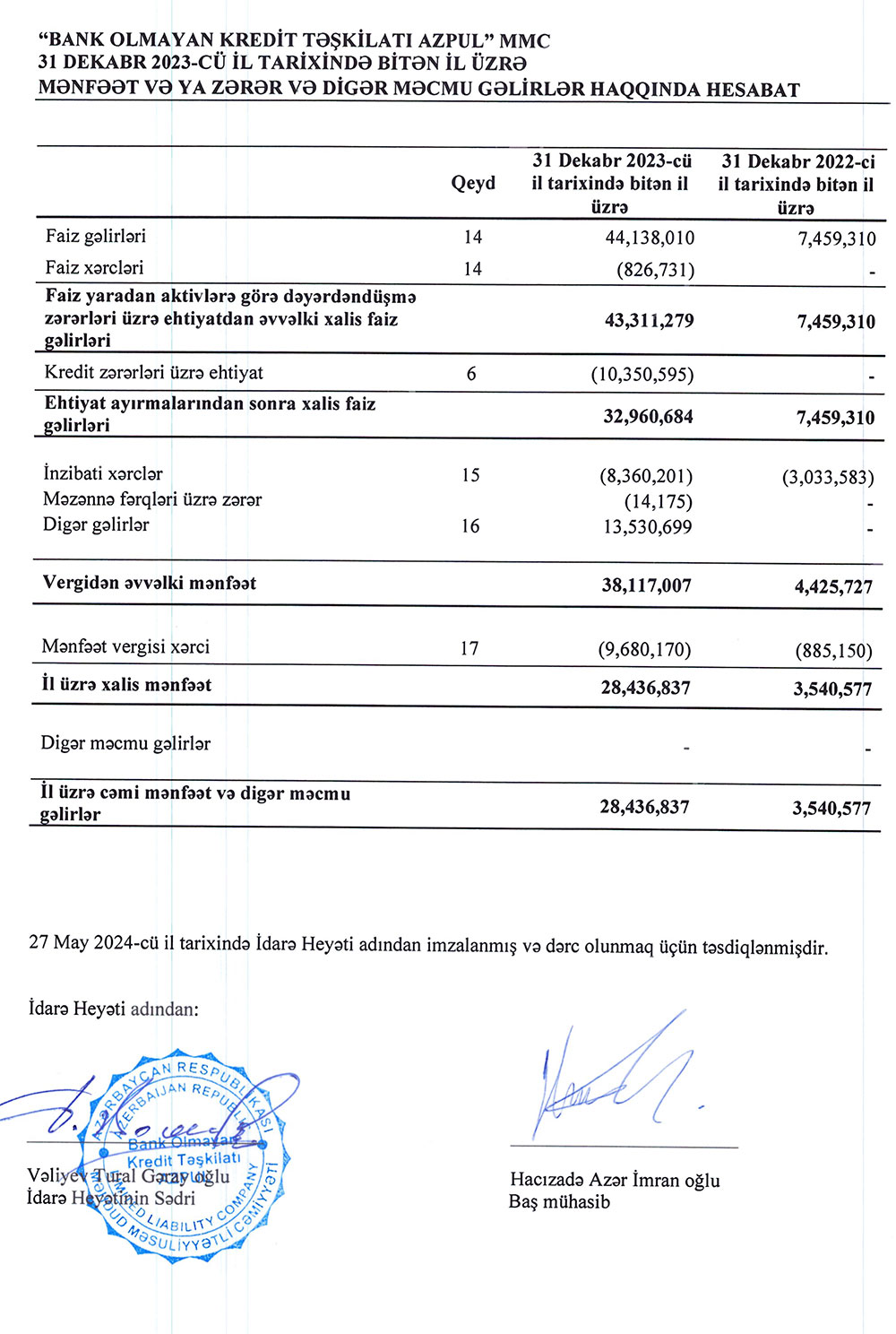 2023-cü ildə "AzPul" MMC kredit zərərləri üçün ehtiyata 10 milyon 351 min manat ayırıb. Bu məbləğdə ayırma təşkilatda gecikmədə olan kreditlərin artdığına işarədir.