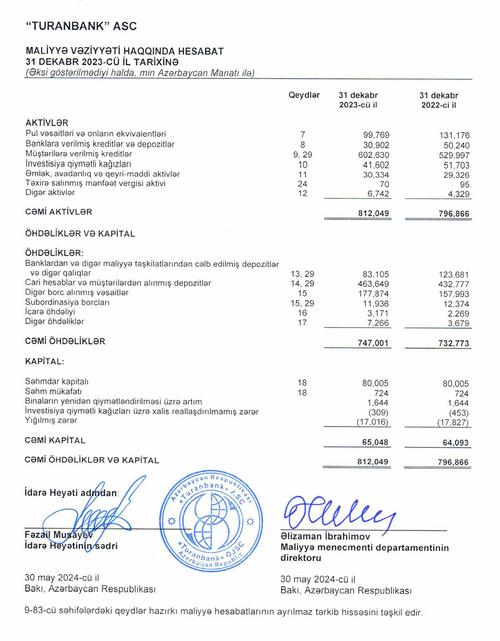 Bu barədə Marja.az Bankın 31 dekabr 2023-cü il tarixində başa çatmış il üzrə Maliyyə Hesabatlarının Beynəlxalq Standartlarına uyğun Hazırlanmış Maliyyə Hesabatlarına istinadən xəbər verir.