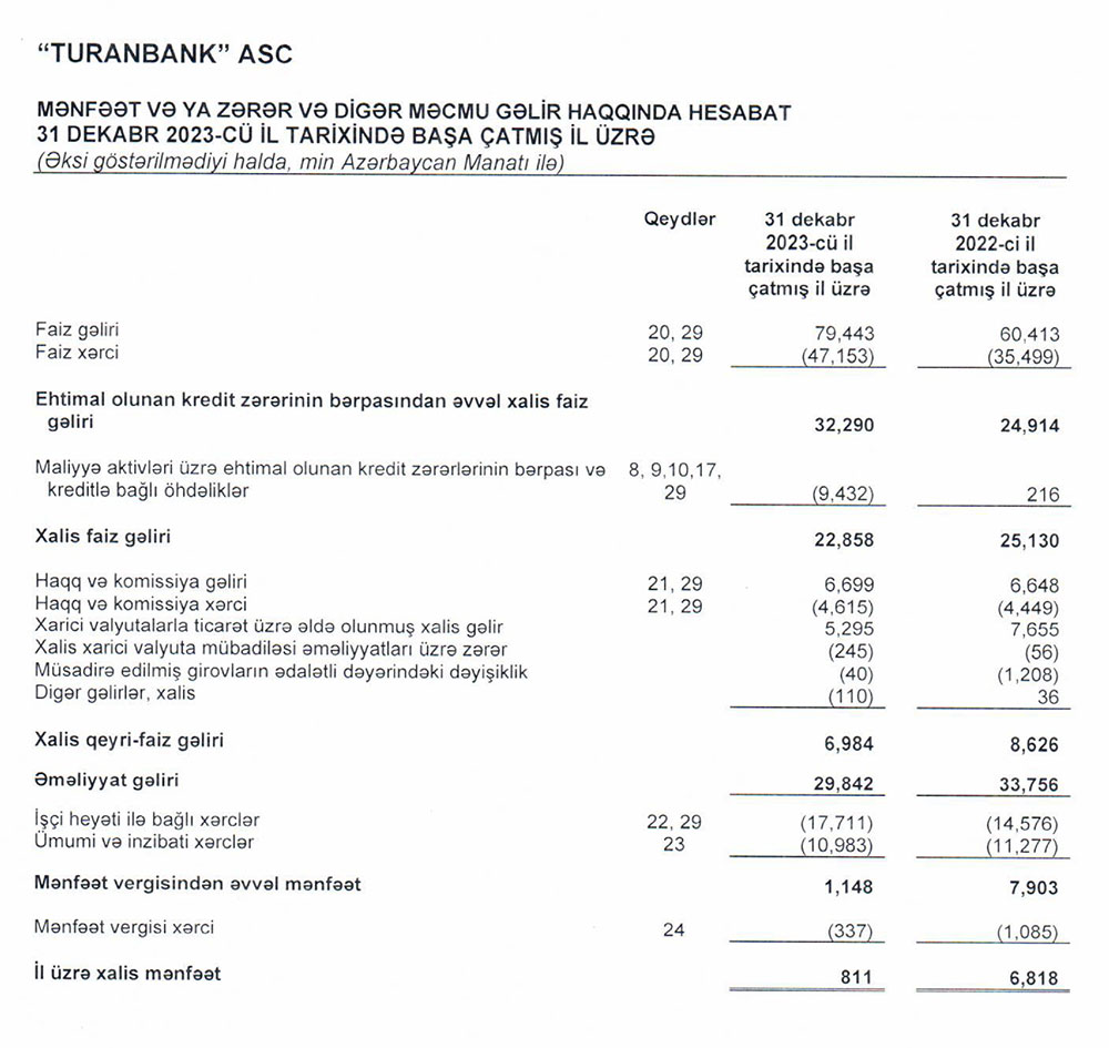 "Turanbank" ASC 2023-cü ili 1 milyon 148 min manat mənfəət vergisindən əvvəlki mənfəət, 811 min manat xalis mənfəət ilə başa vurub.