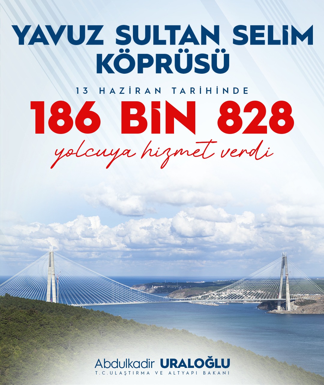 Nazir Uraloğlu, 13 iyun Cümə axşamı günü Yavuz Sultan Səlim körpüsündən 186 min 828 avtomobilin keçməsi ilə yeni rekordun qırıldığını da qeyd edib.