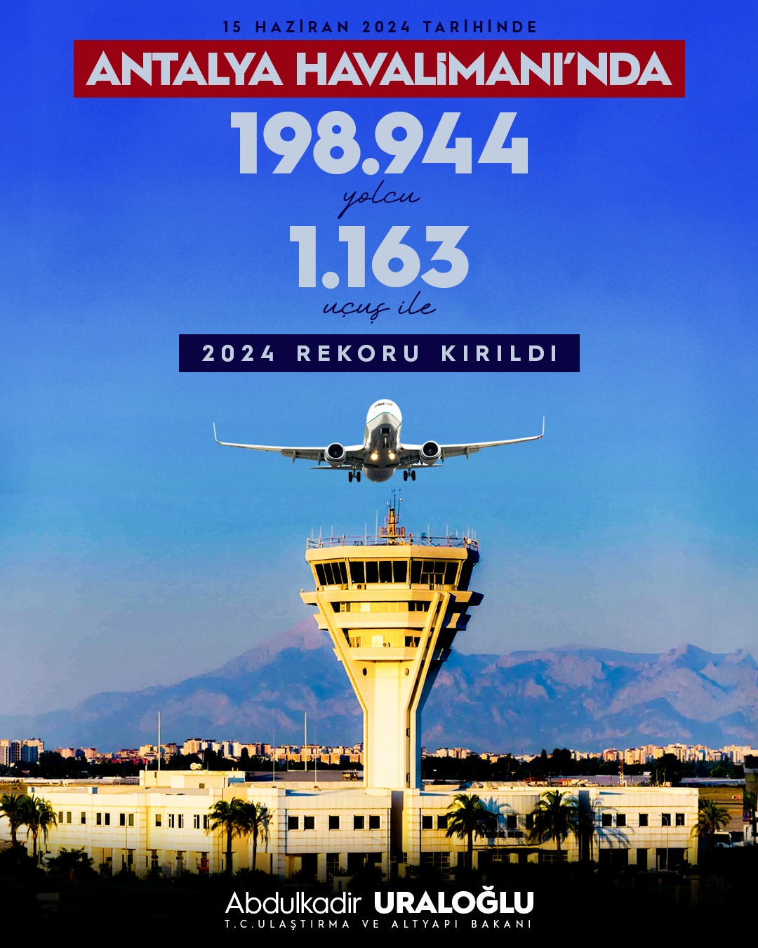 "15 İyunun Şənbə günü Antalya Hava Limanında təyyarə və sərnişin daşımalarında 2024-cü ilin rekordunu qırdıq. Uçuş sayı 1163, sərnişin sayı isə 198 min 944 olub".