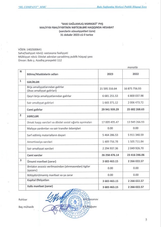 Mərkəz 30 milyon manata yaxın gəlirdən 3,7 milyon manata yaxın xalis mənfəət götürüb.Səhiyyə Nazirliyinin tabeliyində olan Bakı Sağlamlıq Mərkəzi publik hüquqi şəxs 2023-cü ili 3 milyon 683 min manat xalis mənfəət ilə başa vurub. Mərkəz 2022-ci ili 2 milyon 266 min manat xalis mənfəət ilə bağlamışdı. Beləliklə, Bakı Sağlamlıq Mərkəzinin xalis mənfəəti 2023-cü ildə 2022-ci illə müqayisədə 1 milyon 417 min manat və ya 62,5% artıb. Xalis mənfəətin artması Bakı Sağlamlıq Mərkəzinin aldığı dotasiyanın artması ilə əlaqədardır.