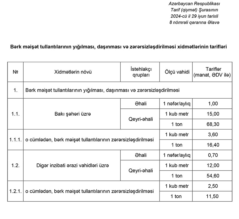 -Bərk məişət tullantılarını zərərsizləşdirilməsi üçün təhvil verən qurum və ya şirkətlər üçün: 1 kub metr üçün 3,60 manat və ya 1 ton üçün 16,40 manat.