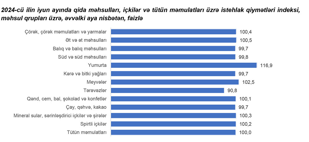Cari ilin iyun ayında əvvəlki aya nisbətən ayrı-ayrı qida məhsullarından daha çox ucuzlaşma qarabaşaq yarmasının, təzə balığın, pasterizə olunmamış üzlü südün, günəbaxan və qarğıdalı yağlarının, bananın, gilasın, alçanın, əriyin, pomidorun, xiyarın, şirin bibərin, badımcanın, göy lobyanın, süfrə çuğundurunun, yerkökünün, sarımsağın, baş soğanın, kartofun, bahalaşma isə əsasən unun, makaronun, mal və qoyun ətinin, yumurtanın, zeytun yağının, limonun, almanın, çiyələyin, kivinin, ağ kələmin, göyərtinin qiymətlərində müşahidə olunmuşdur. Digər qida məhsullarının qiymətlərində ciddi dəyişikliklər baş verməmişdir.