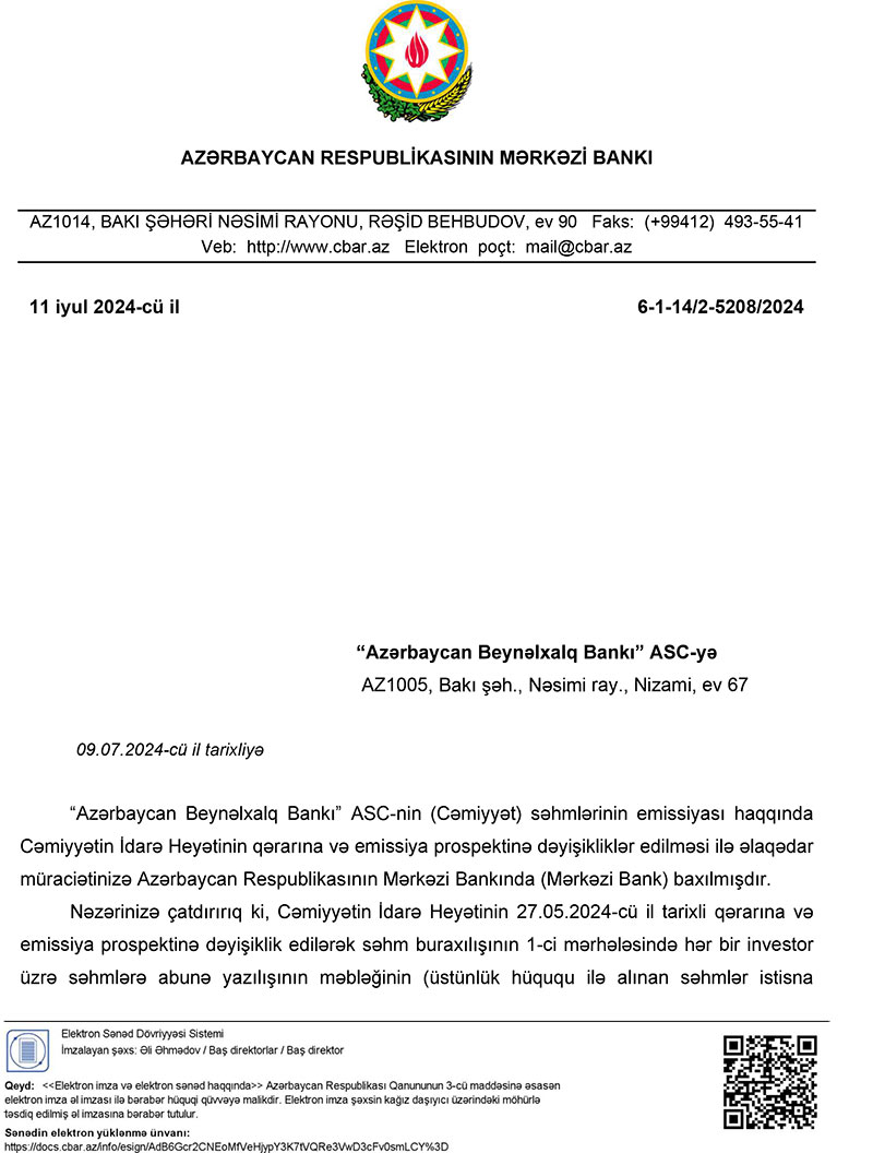 "Azərbaycan Beynəlxalq Bankı" ASC-nin (ABB) kütləvi təklif olunan yeni səhmlərinə abunə yazılışı ilə bağlı şərtlərdən biri dəyişib.