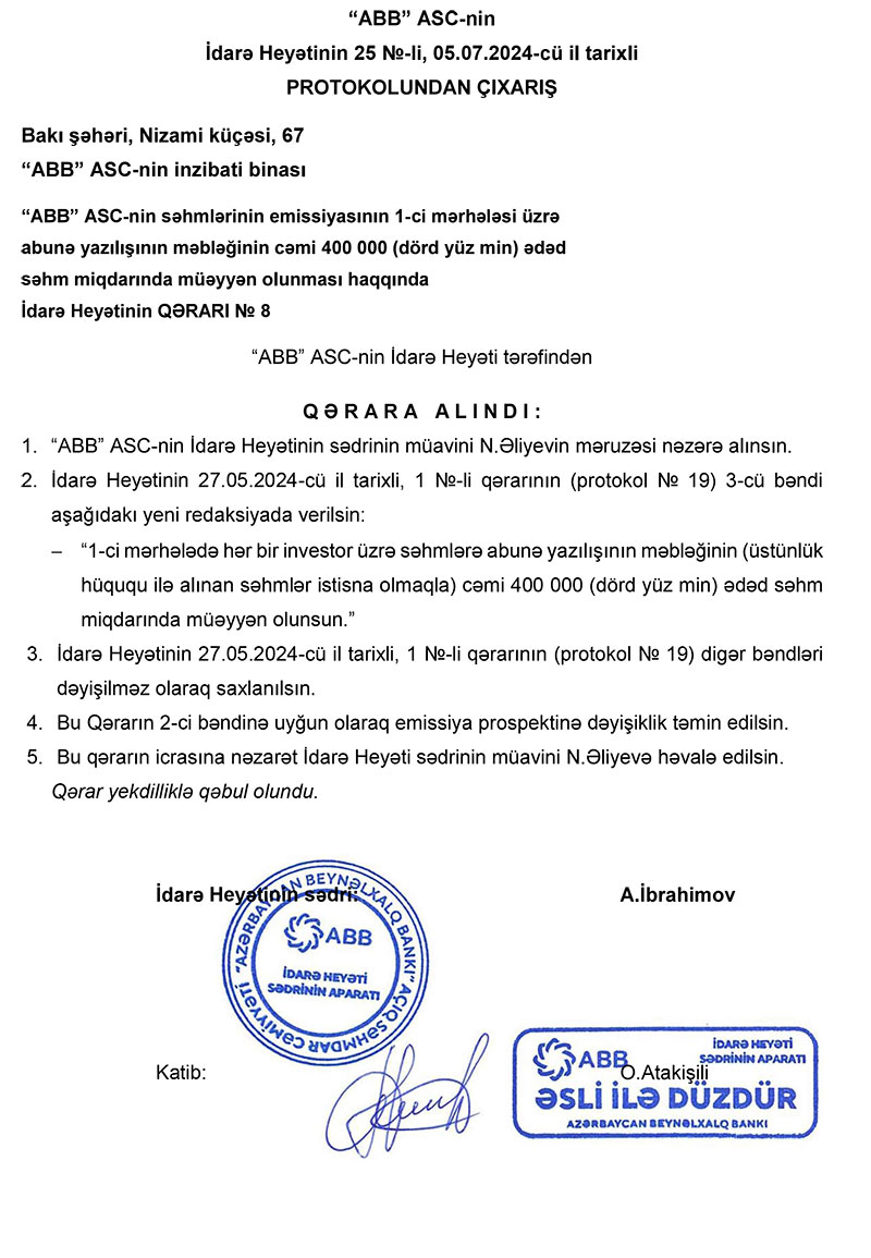 Xəbər verdiyimiz kimi, ABB hər birinin nominal dəyəri 27 qəpik (0,27 manat) olan 322 milyon ədəd yeni səhm buraxıb. Bu səhmlərin yerləşdirilməsilə 86 milyon 940 min manat, xərclər xarix isə xalis 86 milyon 503 min 100 manat cəlb edilməsi nəzərdə tutulur. Hazırda ABB-nin cəmi 1 milyard 225 milyon 647 min 819 manat dəyərində, hər birinin nominal dəyəri 27 qəpik olan 4 milyard 539 milyon 436 min 367 ədəd səhmi mövcuddur. Yerləşdirmə uğurla yekunlaşarsa Bankın səhmlərinin sayı 4 milyard 861 milyon 436 min 367 ədədə, nizamnamə kapitalı isə 1 milyard 312 milyon 587 min 819 manata yüksələcəkdir.