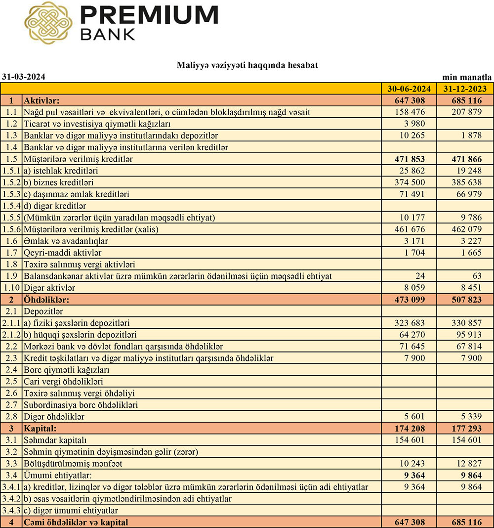 30 iyun 2024-cü il tarixində “Premium Bank” ASC 647 milyon 308 min manat cəmi aktivlərə, 473 milyon 99 min manat cəmi öhdəliklərə malik olub. O cümlədən, cəmi öhdəliklərin 387 milyon 953 min manatını depozitlər təşkil edib.