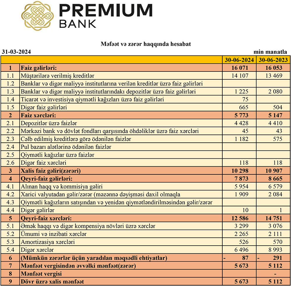Müqayisə üçün qeyd edək ki, 2023-cü ilin ilk 6 ayı ərzində “Premium Bank” ASC-nin cəmi əməliyyat gəlirləri 24 milyon 718 min manat, cəmi əməliyyat xərcləri 19 milyon 898 min manat, əməliyyat mənfəəti 4 milyon 820 min manat təşkil etmişdi. Həmçinin, mümkün zərərlər üçün yaradılan məqsədli ehtiyatlardan azad olan 291 min manat mənfəətə əlavə olunmuşdu.