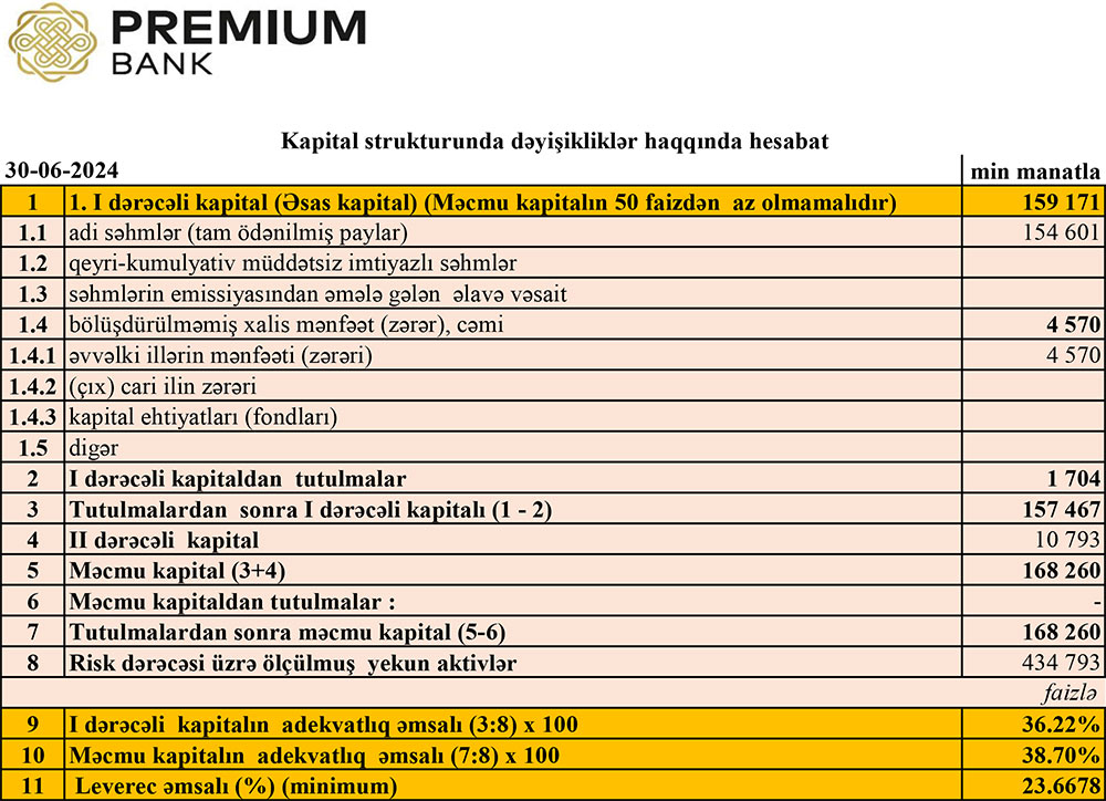 30 İyun 2024-cü il tarixində “Premium Bank” ASC 168 milyon 260 min manat məcmu kapitala malik olub. Bu da, Mərkəzi Bankın kommersiya banklarına qarşı minimal məcmu kapital tələbindən 3 dəfədən çox yüksəkdir.