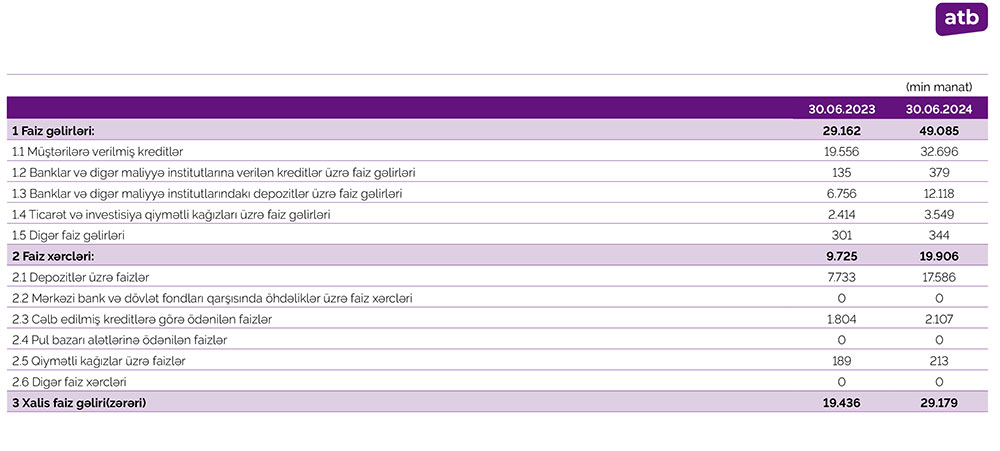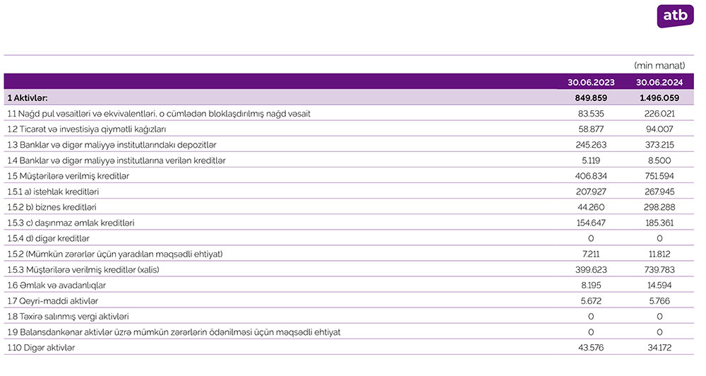 30 iyun 2023 - 30 iyun 2024-cü il dövründə “Azər-Türk Bank”ın cəmi aktivləri 646 milyon 200 min manat və ya 76% artaraq 1 milyard 496 milyon 59 min manata yüksəlib. Bankın kredit portfeli (müştərilərə verilmiş cəmi kreditlər) 344 milyon 760 min manat və ya 84,7% artaraq 751 milyon 594 min manata çatıb. O cümlədən, istehlak kreditləri portfeli 60 milyon 18 min manat artaraq 267 milyon 945 min manata, biznes kreditləri portfeli 254 milyon 28 min manat artaraq 298 milyon 288 min manata, ipoteka kreditləri portfeli 30 milyon 714 min manat artaraq 185 milyon 361 min manata qalxıb.