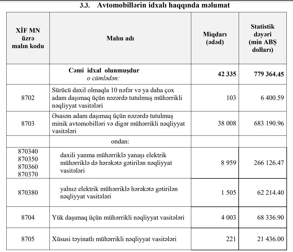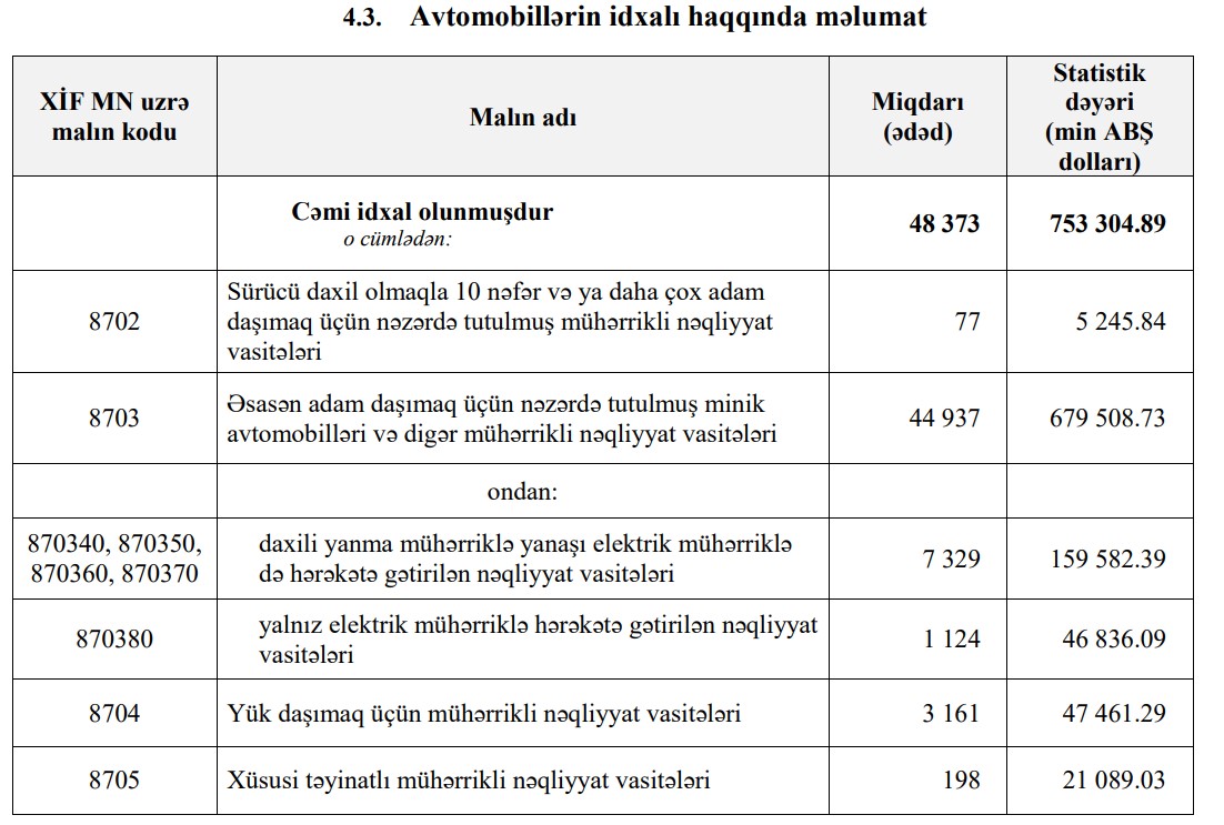 2024-cü ilin ilk 6 ayında Azərbaycana 683 milyon 190 min dollar dəyərində 38 min 8 ədəd minik avvtomobili, o cümlədən 10 min 464 ədəd hibrid və tam elektrik avtomobil idxal olunub. 2023-cü ilin eyni dövründə Azərbaycana 679 milyon 509 min dollar dəyərində 44 min 937 min ədəd minik avtomobili, o cümlədən 8 min 453 ədəd hibrid və tam elektrik avtomobil idxal edilmişdi.