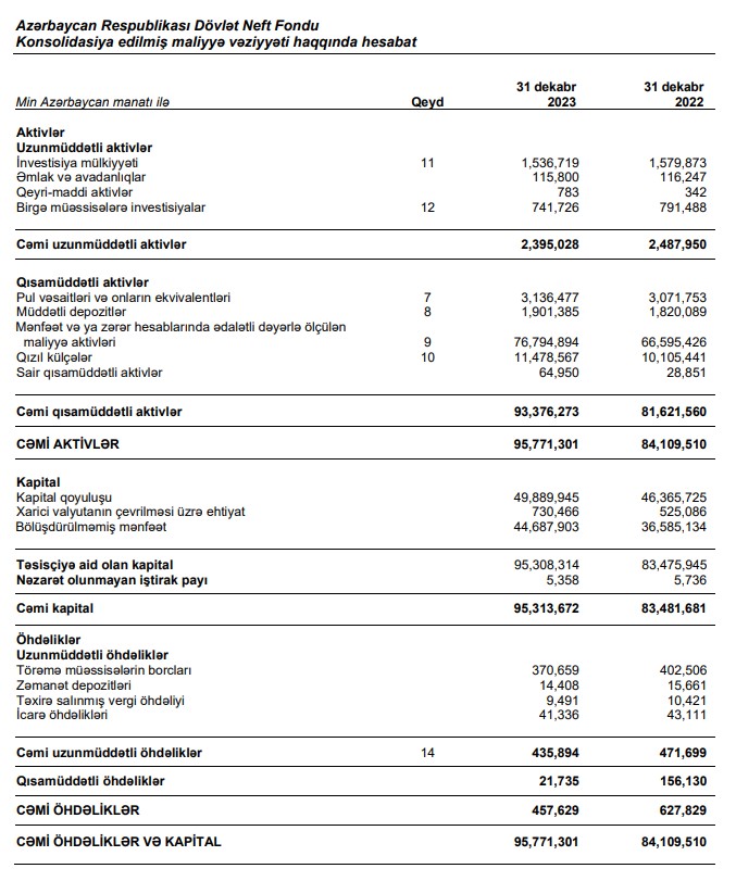 31 dekabr 2023-cü il tarixində Neft Fondunun cəmi aktivləri 95 milyard 771 milyon 301 min manat olub ki, bu da illik müqayisədə 13,9 % çoxdur.
