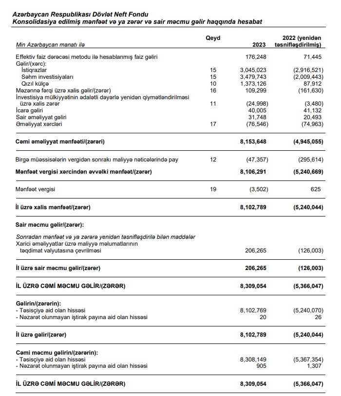 O cümlədən, Fond dötən il istiqrazlara investisiyalardan 3 milyard 45 milyon 23 min manat gəlir (2022-də 2 milyard 916 milyon 521 min manat zərər), səhm investisiyalarından 3 milyard 479 milyon 743 min manat gəlir (2022-də 2 milyard 9 milyon 443 min manat zərər), qızıl külçədən 1 milyard 373 milyon 126 min manat gəlir (2022-də 87 milyon 912 min manat gəlir), məzənnə fərqi üzrə 109 milyon 299 min manat gəlir (2022-də 161 milyon 630 min manat zərər), icarədən 40 milyon 5 min maat gəlir (2022-də 41 milyon 132 min manatgəlir) əldə edib.