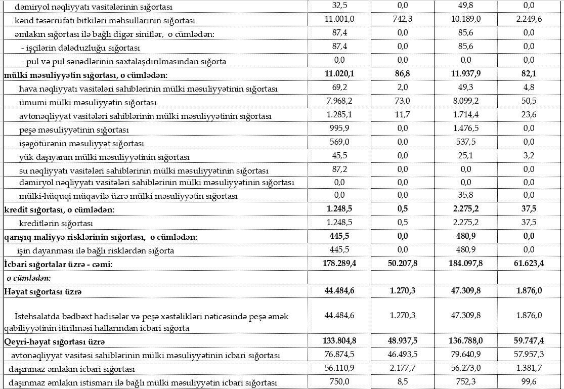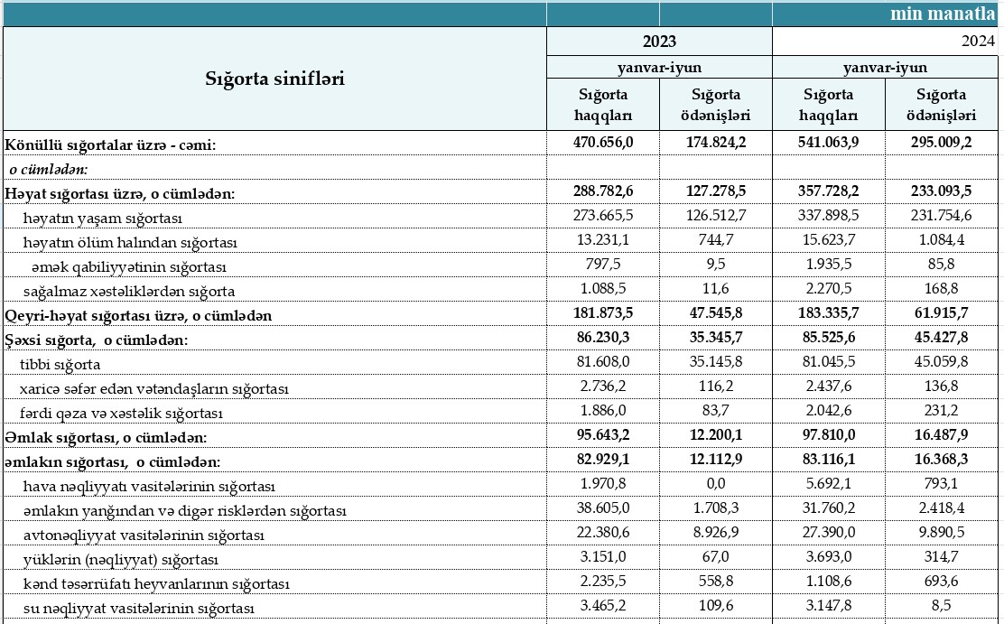 Sığorta növləri üzrə sığorta haqları və sığorta ödənişləri2024-cü ilin ilk 6 ayı ərzində (yanvar-iyun) Azərbaycanın sığorta şirkətləri tərəfindən hesablanmış 725 milyon 161 min manat sığorta haqlarının 357 milyon 728 min manatı və ya 49,3%-i könüllü həyat sığortalarının, 184 milyon 98 min manatı və ya 25,4%-i icbari sığortaların payına düşüb.