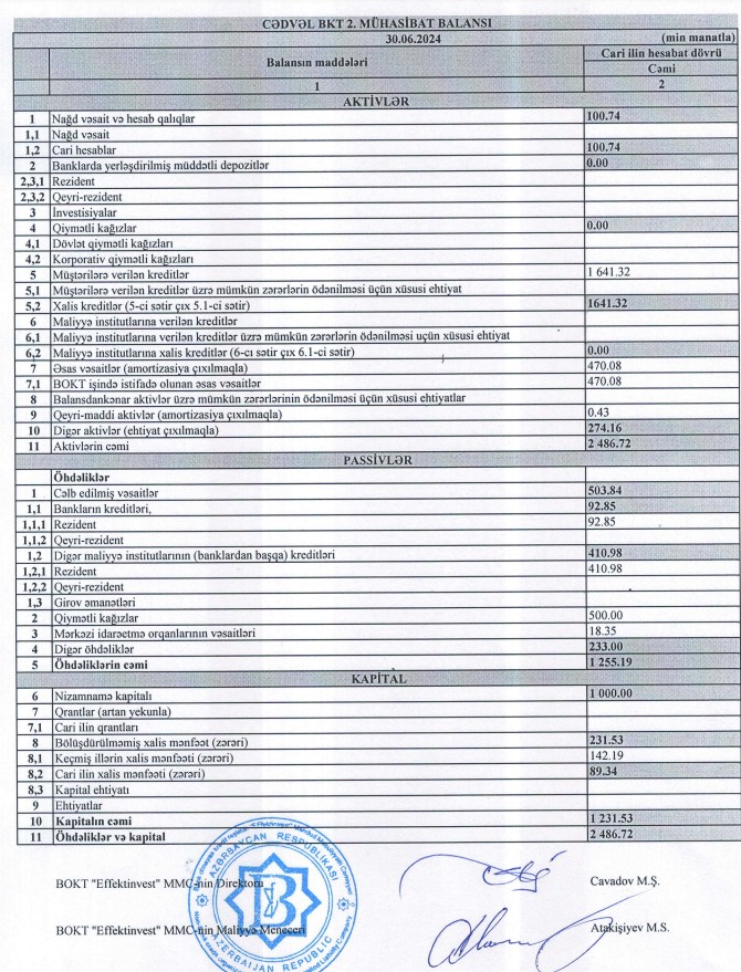 BOKT "Effektinvest" MMC 2024-cü ilin ilk 6 ayını (yanvar-iyun) 89 min 340 manat xalis mənfəət ilə başa vurub. Təşkilat 2023-cü ili 181 min 620 manat xalis mənfəət ilə bağlamışdır.