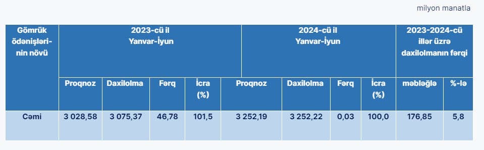 Azərbaycan Respublikasının 2024-cü ilin dürüstləşdirilmiş dövlət büdcəsinə əsasən 2024-cü ilin 6 (altı) ayı üzrə Dövlət Gömrük Komitəsi üçün müəyyənləşdirilən 3 milyard 252,19 milyon manat proqnoza qarşı 3 milyard 252,22 milyon manat gömrük ödənişlərinin toplanaraq dövlət büdcəsinə köçürülməsi təmin olunmuş və büdcə öhdəliyi 100 faiz icra olunmuşdur.