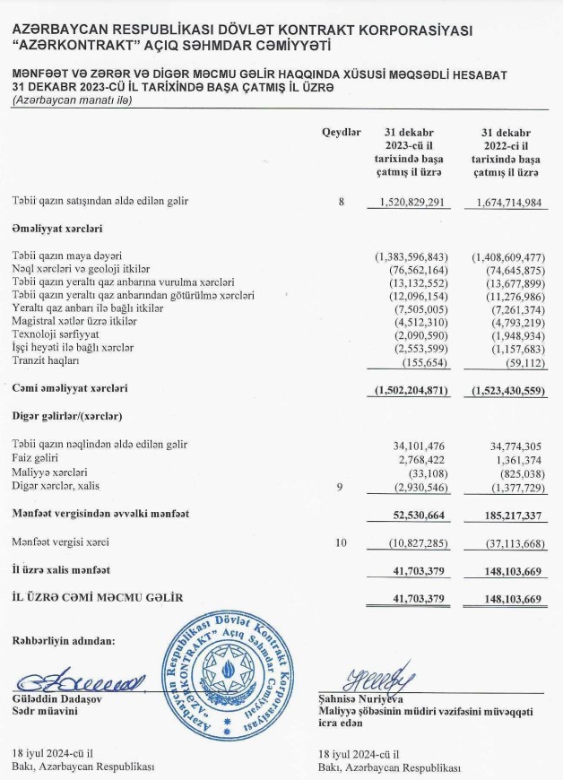 Marja.az “Azərkontrakt” ASC-nin 2023-cü il üzrə Maliyyə Hesabatlarına istinadən xəbər verir ki, “Azərkontrakt” təbii qazın satışından gəliri 2022-ci ildə 1 milyard 674 milyon 715 min manat ikən, 2023-cü ildə 1 milyard 520 milyon 829 min manata düşüb (153 milyon 886 min manat azalıb). Gəlirin azalmasına baxmayaraq Şirkətin əməliyyat xərclərinin cəmi məbləği düşməyib, 2022-ci ildə olduğu kimi 1,5 milyard manat səviyyəsində qalıb.