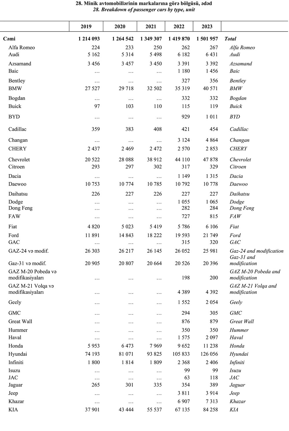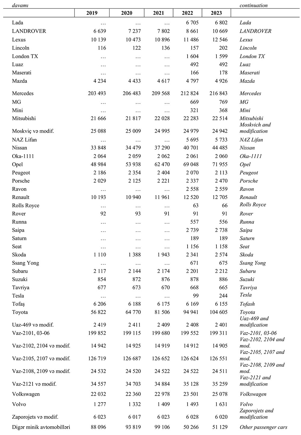 Həmçinin, ötən il Azərbaycanda BMW minik avtomobillərinin sayı 5 min 252 ədəd artaraq 40 min 571 ədədə, Mercedes-Benz minik avtomobillərinin sayı 4 min 19 ədəd artaraq 216 min 843 ədədə, Nissan minik avtomobillərinin sayı 3 min 784 ədəd artaraq 44 min 485 ədədə, Chevrolet minik avtomobillərinin sayı 3 min 768 ədəd aratarq 47 min 878 ədədə, Opel minik avtomobillərinin sayı 2 min 907 ədəd artaraq 71 min 955 ədədə, Ford minik avtomobillərinin sayı 2 min 156 ədəd artaraq 21 min 749 ədədə, Land Rover minik avtomobillərinin sayı 2 min 8 ədəd artaraq 10 min 669 ədədə, Changan avtomobillərinin sayı 1740 ədəd artaraq 4 min 864 ədədə, Honda minik avtomobillərinin sayı 1586 ədəd artaraq 11 min 238 ədədə, Volkswagen minik avtomobillərinin sayı 1577 ədəd artaraq 25 min 78 ədədə, Lexus minik avtomobillərinin sayı 1060 ədəd artaraq 12 min 546 ədədə yüksəlib.