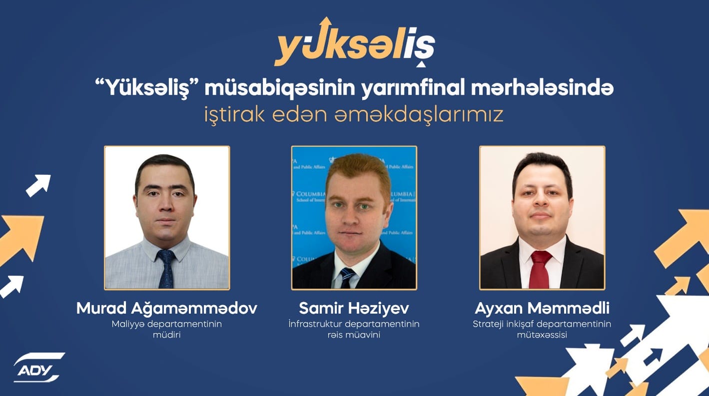 Bu il isə ADY-nin iki əməkdaşı – strateji inkişaf departamentinin direktoru Anar Qasımov və “ADY Express” MMC-nin baş maliyyə inzibatçısı Kamal Hüseynli finala çıxaraq müsabiqənin qalibi olub, üç əməkdaşı-maliyyə departamentinin müdiri Murad Ağaməmmədov, infrastruktur departamentinin rəis müavini Samir Həziyev və strateji inkişaf departamentinin mütəxəssisi Ayxan Məmmədli “Yüksəliş” müsabiqəsinin yarımfinal mərhələsinə yüksəlib.