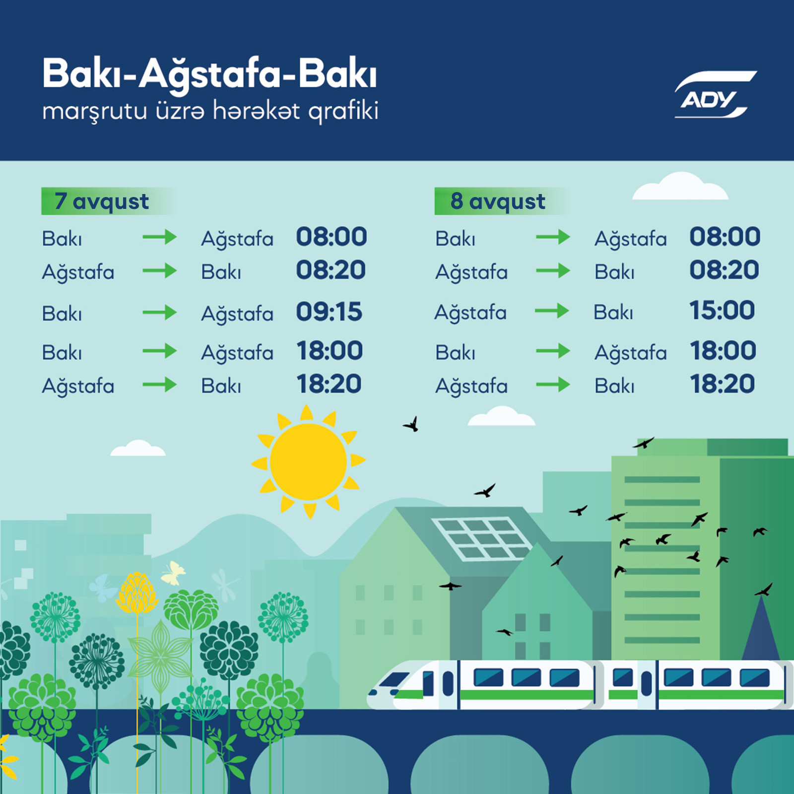 “Azərbaycan Dəmir Yolları” QSC (ADY) sərnişin tələbatını təmin etmək məqsədilə 7 və 8 avqust tarixlərində Bakı-Ağstafa-Bakı marşrutu üzrə əlavə qatar reysləri təyin edir.