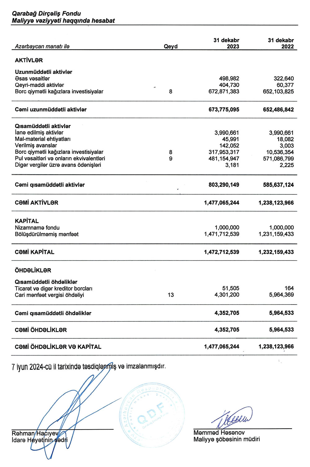 31 dekabr 2023-cü il tarixində Qarabağ Dirçəliş Fondu 1 milyard 477 milyon 65 min manat cəmi aktivlərə, 1 milyard 471 milyon 712 min manat bölüşdürülməmiş mənfəətə malik olub. O cümlədən, bölüşdürülməmiş mənfəətin 990 milyon 825 min manatını borc qiymətli kağzılarına investisiyalar, 481 milyon 155 min manatını nağd vəsaitlər təşkil edib.