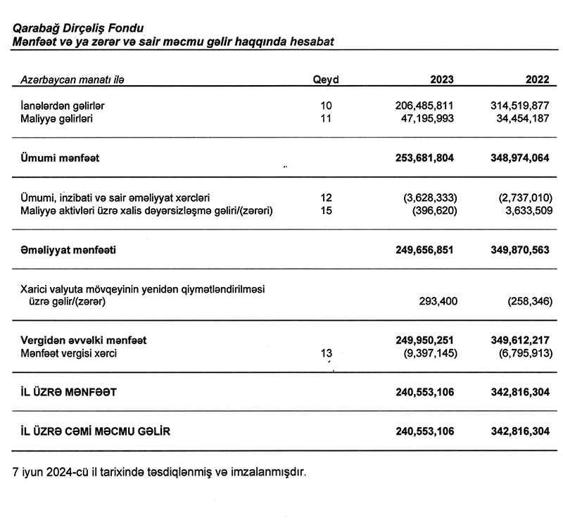 Qarabağ Dirçəliş Fondu 2023-cü ili 240 milyon 553 min manat xalis mənfəət ilə başa vurub. Fond 2022-ci ili 342 milyon 816 min manat xalis mənfəət ilə bağlamışdı. Beləliklə, ötən il Qarabağ Dirçəliş Fondunun xalis mənfəəti 102 milyon 263 min manat və ya 29,8% azalıb. Xalis mənfəətin azalması ianədən gəlirlərin azalması ilə bağlıdır.