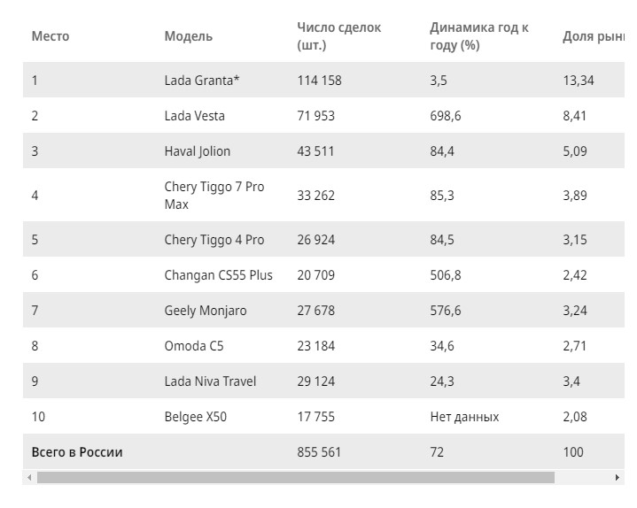 Xarici avtomobillər arasında ən çox Haval modelləri satılıb. Bu markanın satışları 1,95 dəfə artaraq 16,7 min ədədə təşkil edib. Changan ilk 5-likdə daha aktiv artım tempi göstərir - 2,2 dəfə çox olmaqla 11,4 min avtomobil satılıb. Chery-nin satışları 32,5% artaraq 14,2 min ədədə, Geely-nin satışları 49,1% artaraq 13,1 min ədədə çatıb. İyul ayında satışlarda azalma göstərən ilk 10-luqda yeganə brend Exeed olub.