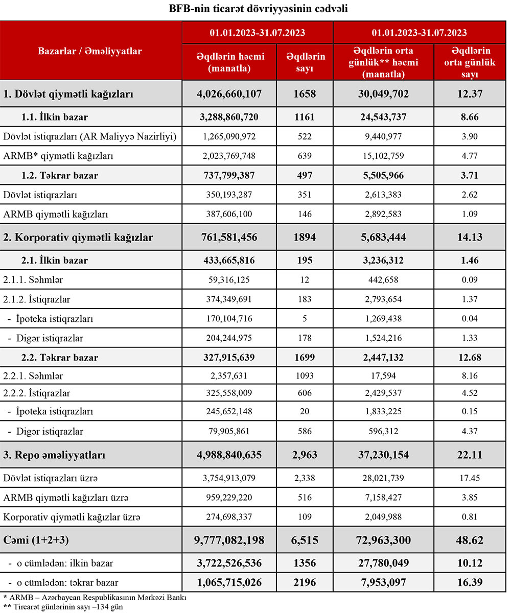 Ötən ilin müvafiq dövrü ilə müqayisədə korporativ qiymətli kağızaların ticarət həcmində 65%, dövlət qiymətli kağızların ticarət həcmində 8%, repo əməliyyatları üzrə 3,7 dəfə artım olub. O cümlədən, ötən il ilə müqayisədə korporativ qiymətli kağızların repo əməliyyatları bazarı 7,3 dəfə artıb.