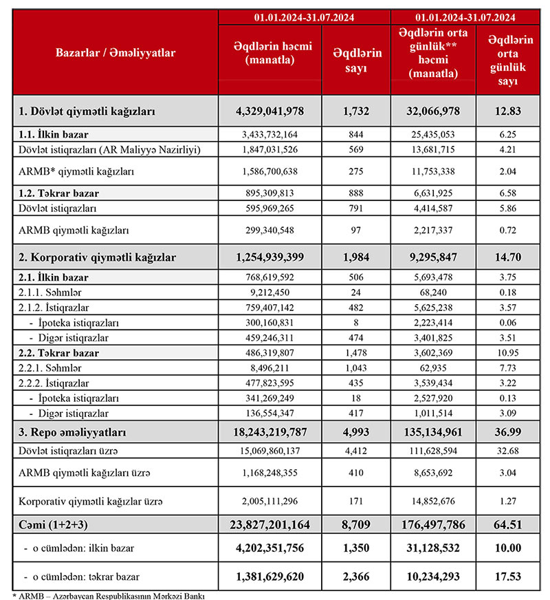 2024-cü ilin yanvar-iyul ayları ərzində Bakı Fond Birjasında qiymətli kağızlar üzrə keçirilən əməliyyatların ümumi həcmi 23 milyard 827 milyon 201 min manat təşkil edib. 2023-cü ilin yanvar-iyul ayları ərzində Birjada qiymətli kağızlar üzrə keçirilən əməliyyatların ümumi həcmi 9 milyard 777 milyon 82 min manat təşkil etmişdi. Beləliklə, bu il BFB-də əməliyyatların həcmi 2,4 dəfə artıb. Artım əsasən, repo əməliyyatlarının həcminin artmasından qaynaqlanır.