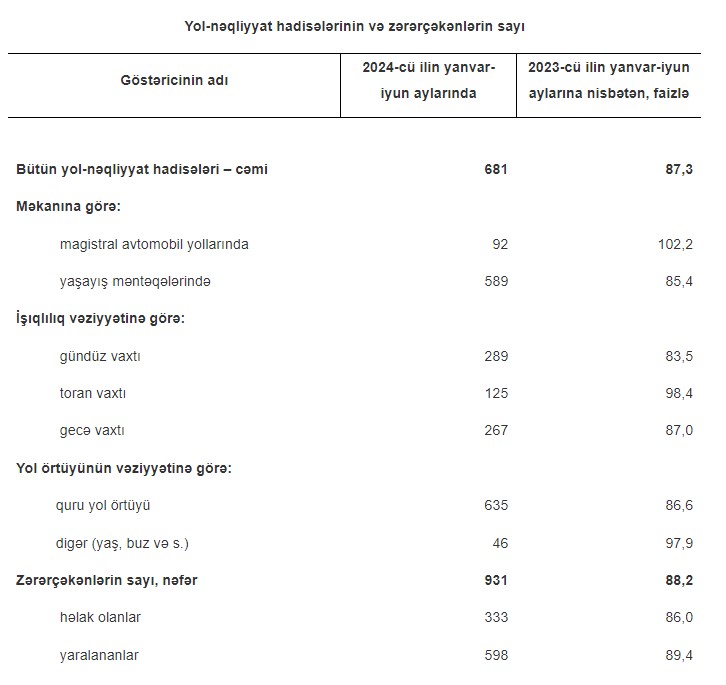 Dövlət Statistika Komitəsinin məlumatına görə, 2024-cü ilin yanvar-iyun aylarında 681 və ya 2023-cü ilin müvafiq dövrü ilə müqayisədə 12,7 faiz az yol-nəqliyyat hadisəsi baş vermiş, bu hadisələr nəticəsində zərər çəkən şəxslərin sayı 11,8 faiz azalaraq 931 nəfər olmuşdur.
