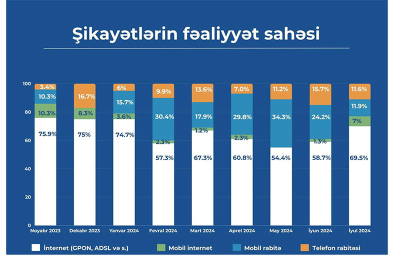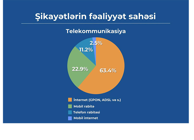 Telekommunikasiya sahəsində (ümumilikdə 4 sahə – “İnternet telekommunikasiya xidmətləri (GPON, ADSL və s.)”, “Mobil internet”, “Mobil rabitə” və “Telefon rabitəsi”), 91 operator və provayderin şəxsi kabinetinə şikayətlər daxil olub. Şikayətlərin 63,4%-i sabit internet xidmətlərini əhatə edir. Mobil rabitə barəsində olan şikayətlər 22,9%, telefon rabitəsi barədə olan şikayətlər 11,2% və mobil internet barəsində olan şikayətlər isə yerdə qalan 2,5%-i təşkil edir.