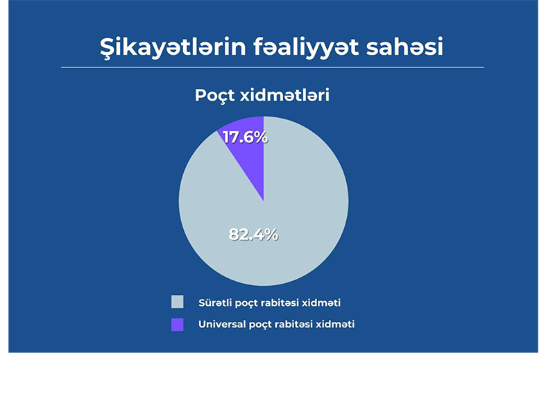 Cari ilin aprel ayından etibarən “E-Şikayət” sistemi vasitəsilə poçt (karqo) rabitəsi operatorları ilə bağlı müraciətlərin qəbuluna da başlanıb. Belə ki, qısa zamanda bu istiqamətdə 34 müraciət daxil olub. Həmin müraciətlərin 82,4%-i sürətli poçt rabitəsi xidmətləri üzrə, 17,6%-i isə universal poçt rabitəsi xidmətləri üzrə olub.