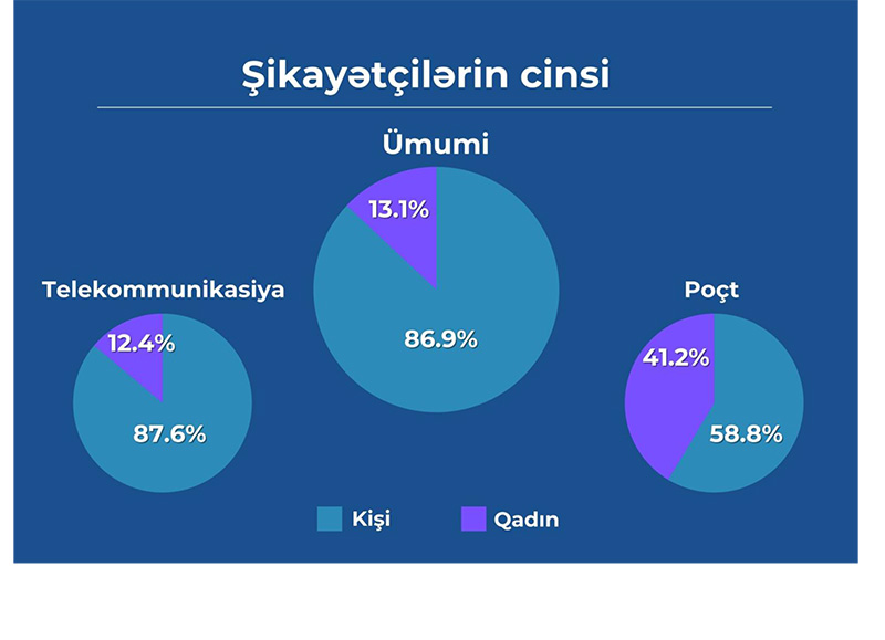 Telekommunikasiya sahəsində edilən şikayətlərin 87,6%-i kişilərə, 12,4%-i qadınlara məxsusdur. Poçt rabitəsi sahəsindəki şikayətlərə diqqət etsək, burada kişi və qadınların nisbətinin bərabərliyə daha yaxın olduğunu görərik. Belə ki, qeyd edilən sahədə müraciət edənlərin 58,8%-i kişi olduğu halda 41,2% şikayətçi qadındır.