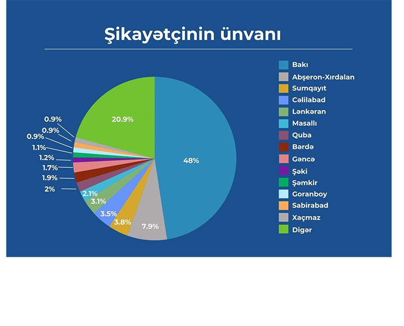 Şikayətlərin coğrafiyasına gəldikdə, 48% müraciət Bakı şəhərindən edilib. Eyni zamanda Abşeron – Xırdalan üzrə şikayətlərin payı 7,9%, Sumqayıt şəhəri üzrə 3,8%, Cəlilabad rayonu üzrə 3,5%, Lənkəran rayonu üzrə isə 3,1% təşkil edib. Belə ki, Agentliyə daxil olan şikayətlərin ümumilikdə 66,3%-i bu 5 ərazi vahidinin payına düşüb.