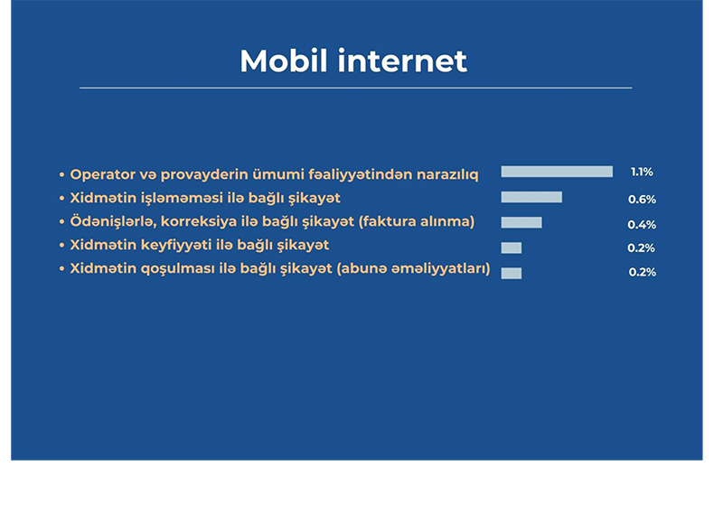 “Mobil internet” sahəsi üzrə şikayətlərdə “Operator və ya provayderin ümumi fəaliyyətindən narazılıq” (1,1%) və “Xidmətin işləməməsi ilə bağlı şikayətlər” (0,6%) alt kateqoriyaları ilk iki yeri tutur. Bu qrupda ən çox şikayət olunan 3-cü alt sahə isə “Ödənişlərlə, korreksiya ilə bağlı şikayət (faktura alınma)” (0,4%) bölməsidir.