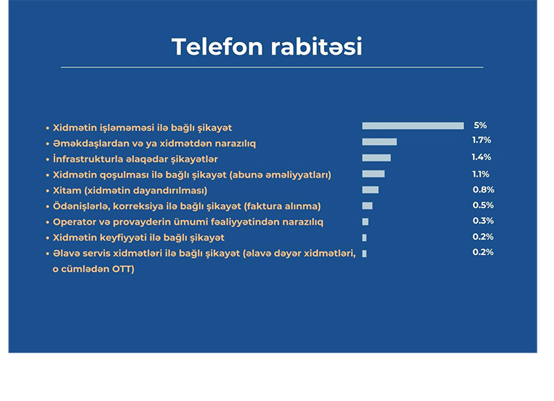 “Telefon rabitəsi” sahəsi üzrə “Xidmətin işləməməsi ilə bağlı” (5%), “Əməkdaşlardan və ya xidmətdən narazılıq” (1,7%) və “İnfrastrukturla əlaqədar” (1,4%) alt kateqoriyaları bu kateqoriya şikayətlərinin ilk üçlüyünü təşkil edir.