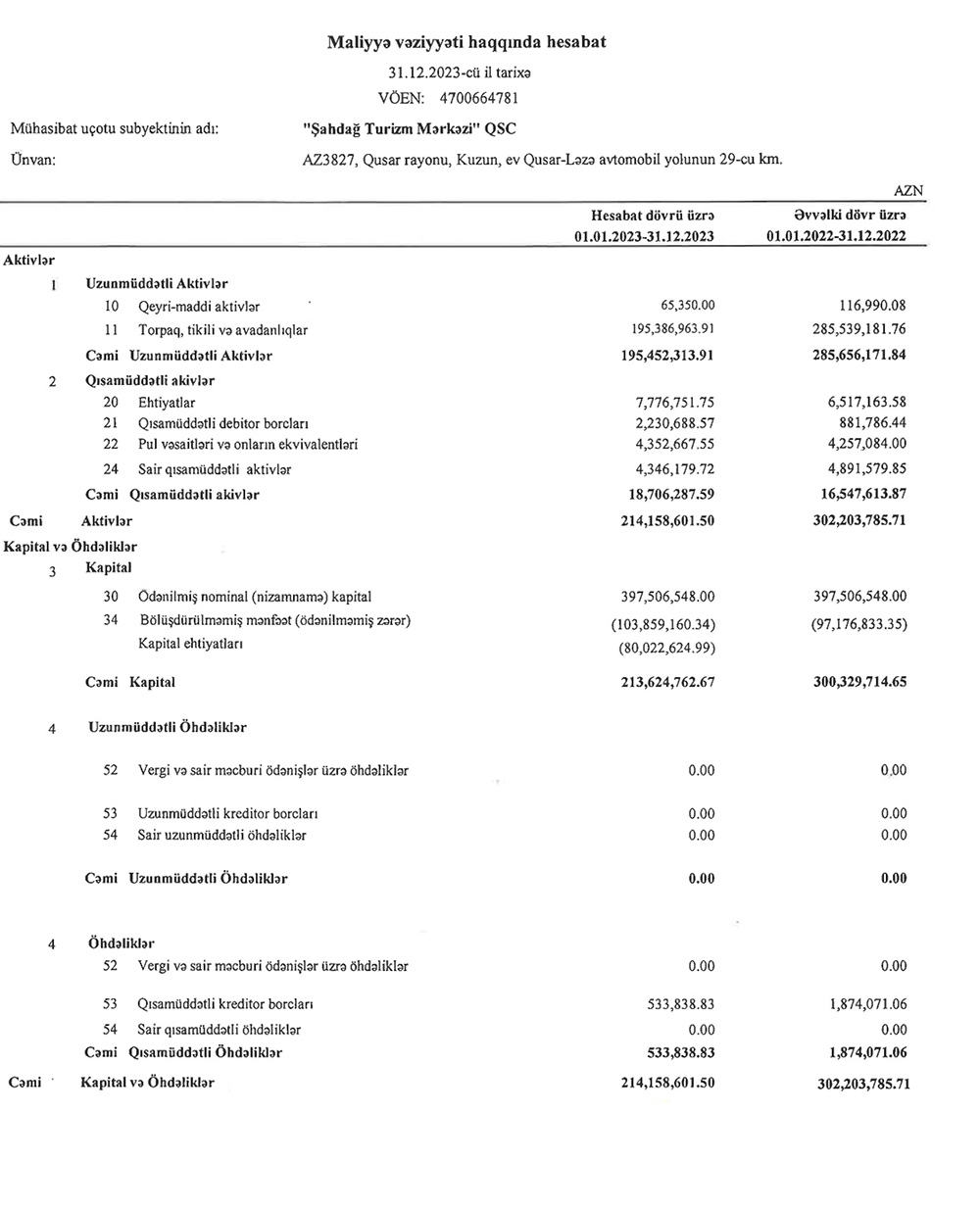 "Şahdağ Turizm Mərkəzi"nin ödənilməmiş zərəri (yığılmış zərər) 2022-ci ilin sonunda 97 milyon 177 min manat ikən, 2023-cü ilin sonunda 103 milyon 859 min manata çatıb. Nəticədə Şirkətin 397 milyon 507 min manat kapitalı azalıb.