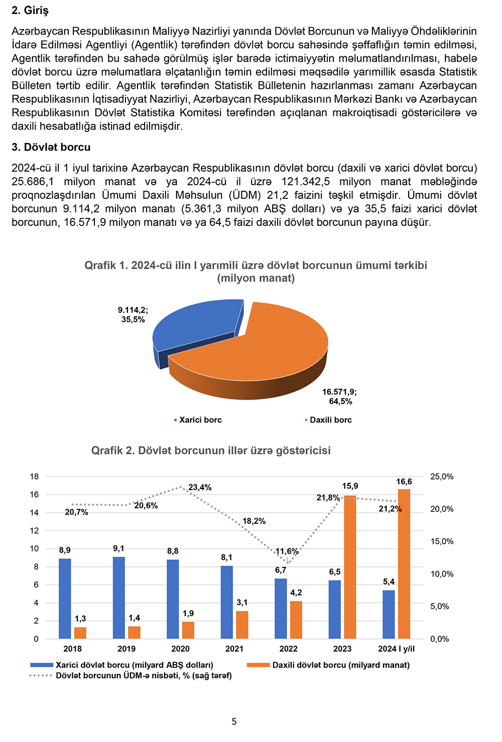 2024-cü il 1 iyul tarixinə Azərbaycan Respublikasının dövlət borcu (daxili və xarici dövlət borcu) 25 milyard 686,1 milyon manat və ya 2024-cü il üzrə 121 milyard 342,5 milyon manat məbləğində proqnozlaşdırılan Ümumi Daxili Məhsulun (ÜDM) 21,2 faizini təşkil etmişdir.