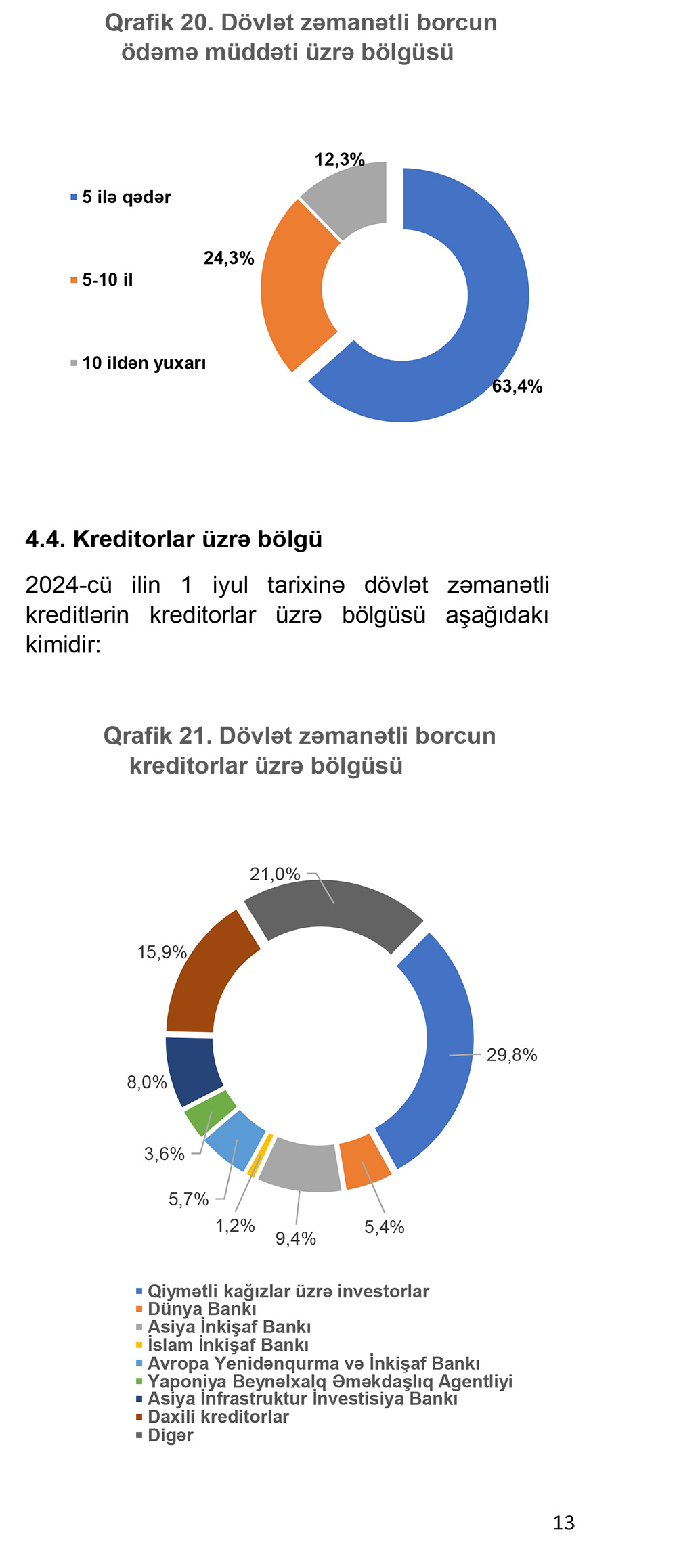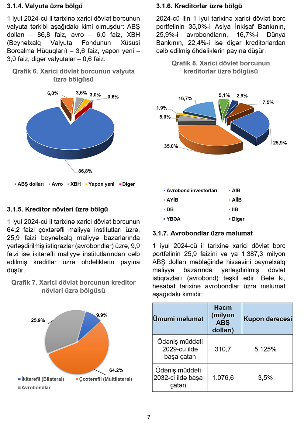 Marja.az xəbər verir ki, bu, Azərbaycan Respublikasının Maliyyə Nazirliyi yanında Dövlət Borcunun və Maliyyə Öhdəliklərinin İdarə Edilməsi Agentliyi “2024-cü ilin I yarımili üzrə Dövlət Borcuna dair Statistik Bülleten”ində bildirilir.
