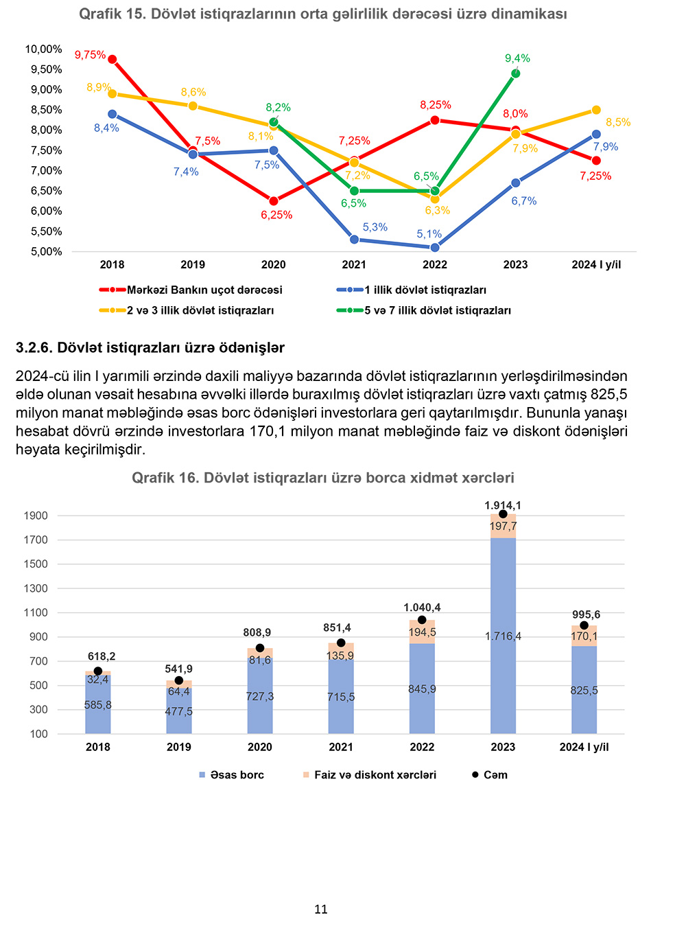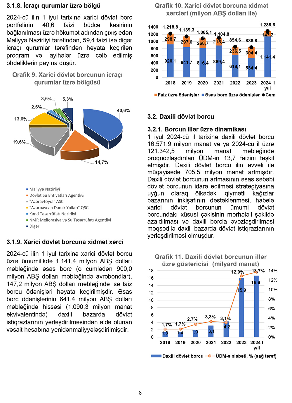 1 iyul 2024-cü il tarixinə daxili dövlət borcu 16 milyard 571,9 milyon manat və ya 2024-cü il üzrə 121 milyard 342,5 milyon manat məbləğində proqnozlaşdırılan ÜDM-in 13,7 faizini təşkil etmişdir. Daxili dövlət borcu ilin əvvəli ilə müqayisədə 705,5 milyon manat artmışdır. Daxili dövlət borcunun artmasının əsas səbəbi dövlət borcunun idarə edilməsi strategiyasına uyğun olaraq ölkədəki qiymətli kağızlar bazarının inkişafının dəstəklənməsi, habelə xarici dövlət borcunun ümumi dövlət borcundakı xüsusi çəkisinin mərhələli şəkildə azaldılması və daxili borcla əvəzləşdirilməsi məqsədilə daxili bazarda dövlət istiqrazlarının yerləşdirilməsi olmuşdur.