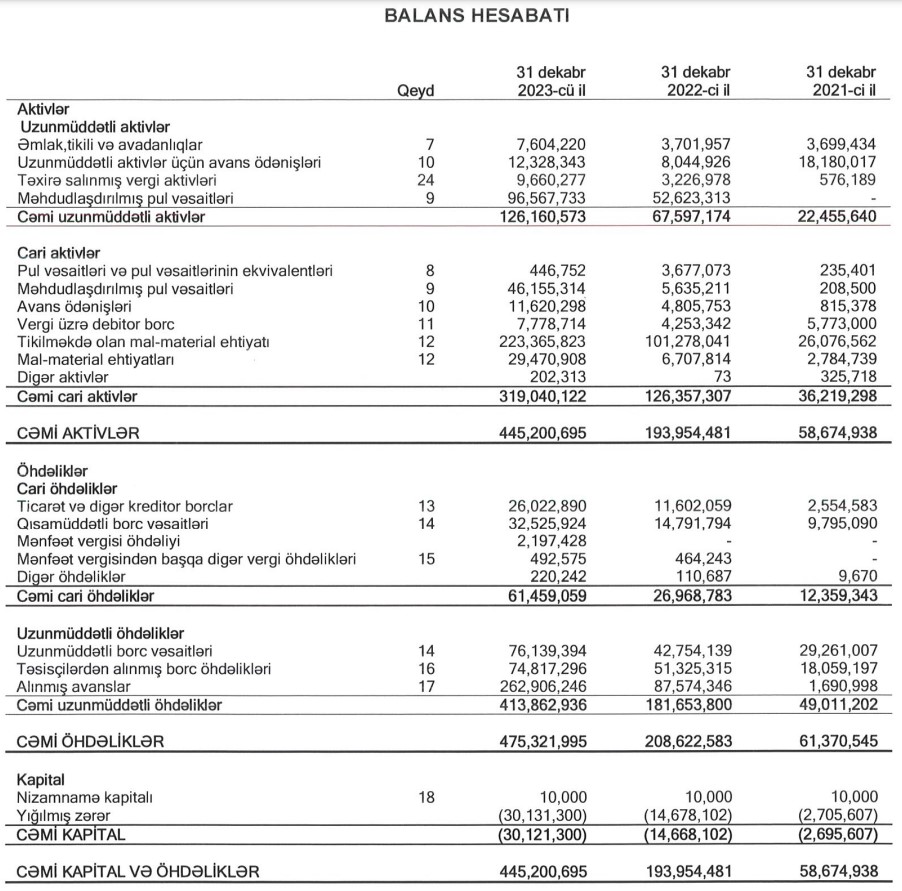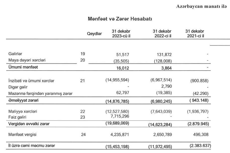 Marja.az Şirkətin başa çatmış son 3 maliyyə ili üzrə audit edilmiş maliyyə hesabatlarına istinadən xəbər verir ki, "Kristal Bakı" ASC 2021-ci ili 2 milyon 384 min manat, 2022-ci ili 11 milyon 972 min manat, 2023-cü ili 15 milyon 453 min manat xalis zərər ilə başa vurub. 31 dekabr 2023-cü il tarixində Şirkətin yığılmış zərəri 30 milyon 131 min manat təşkil edib. Şirkətin cəmi kapitalı mənfi 30 milyon 121 min manat olub.
